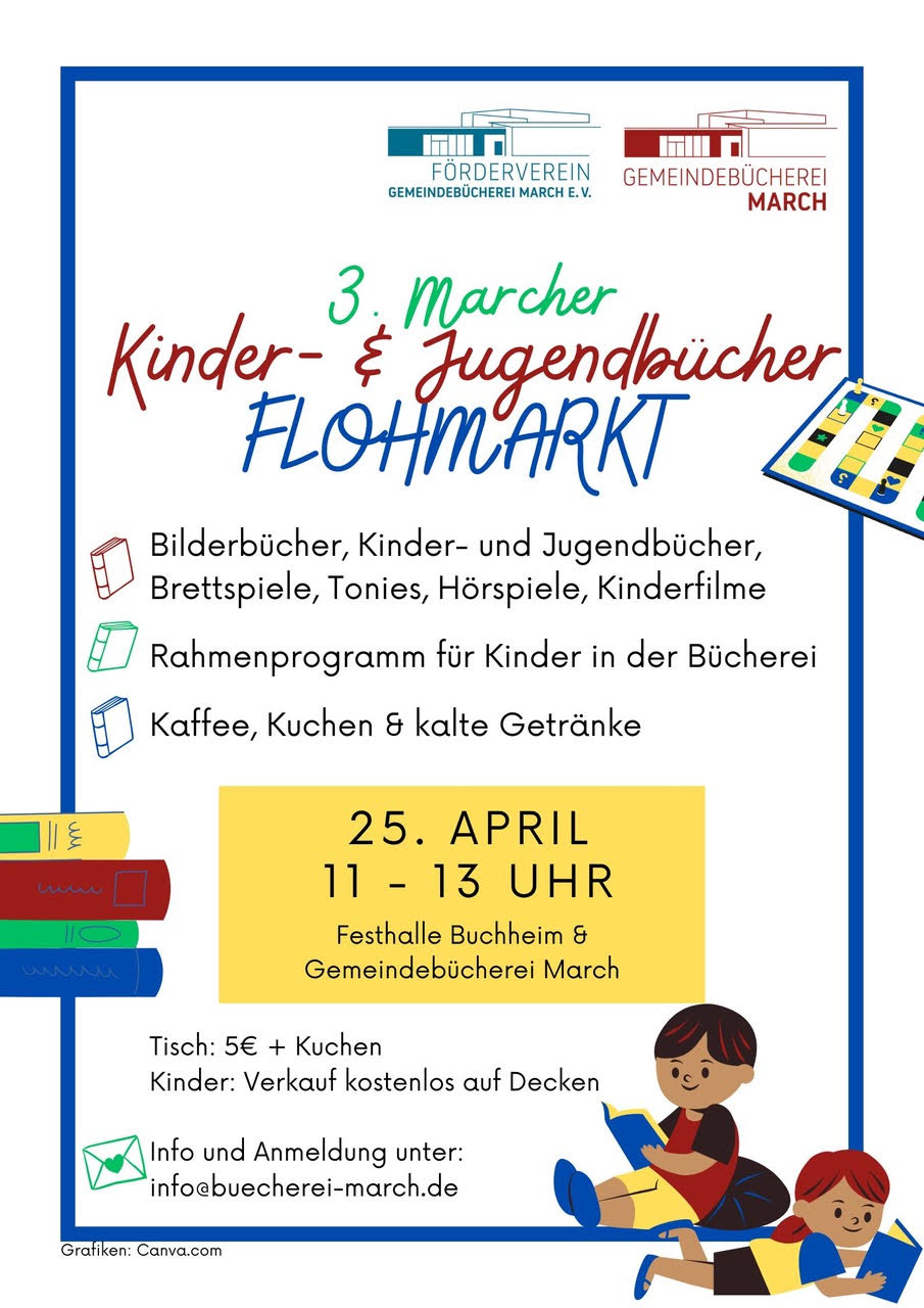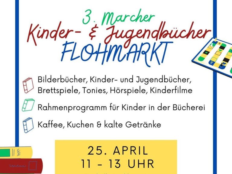 Der Marcher Kinder- und Jugendbücher-Flohmarkt findet in der Festhalle Buchheim sowie in der Gemeindebücherei statt, den wir gemeinsam mit der Gemeindebücherei veranstalten. Die Standgebühren sowie die Einnahmen aus dem Verkauf von Kaffee und Kuchen kommen der Bücherei zugute.